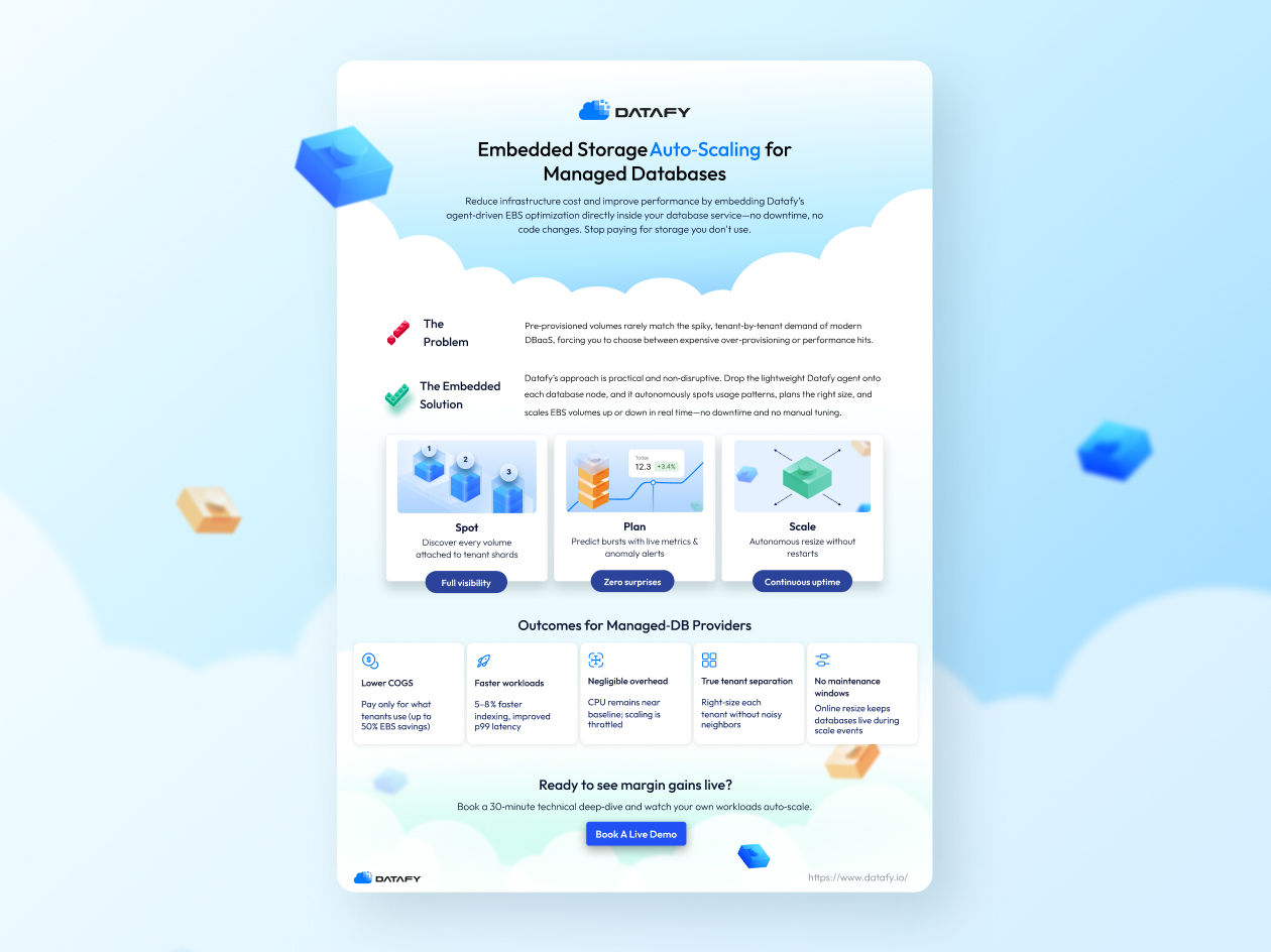 Datafy helps DevOps and FinOps teams cut cloud storage costs, automatically. Their platform right-sizes AWS EBS volumes in real time, saving teams up to 50% without writing a single line of code.